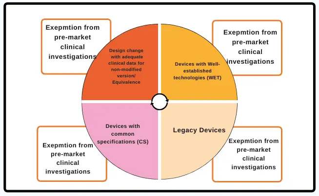 In the case of implantable devices and class III devices, clinical investigations are required to generate adequate clinical data on safety and performance. However clinical investigations are exempted in the following cases: